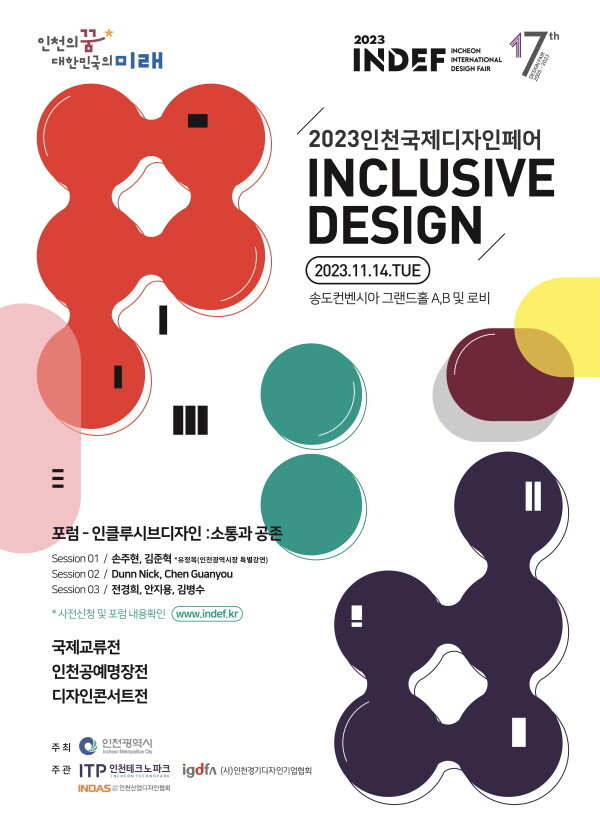 유정복 시장은 ‘시민이 행복한 초일류 도시 인천’을 주제로 축사하고 해외 연사로는 닉던(Dunn, Nick) 영국 랭커스터대학 교수와 첸콴유(Chen Guanyou) 싱가폴국립디자인텐터 본부장이 내한해 인클루시브 디자인에 대한 강연을 펼친다.