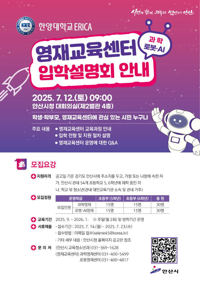 | ▲ 한양대학교 ERICA 영재교육센터 입학 설명회 개최 안내 포스터 /자료제공=안산시 |