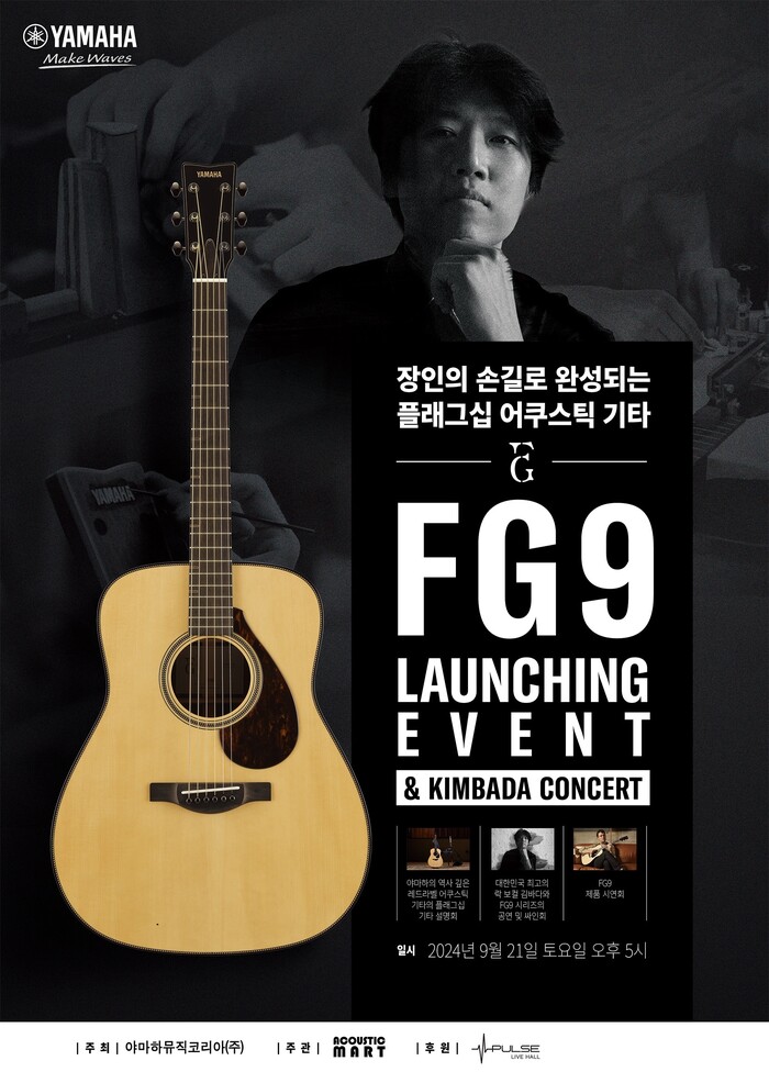 야마하뮤직코리아에서는 ‘FG9’ 어쿠스틱 기타 시리즈 출시를 기념하여 ‘FG9 론칭 이벤트’도 개최한다. 오는 9월 21일 토요일 오후 2시부터 서울 서초구 펄스 라이브홀에서 아티스트 김바다의 특별 세미나와 더불어 콘서트를 선보일 예정이다. 자세한 내용 및 참가 신청은 야마하뮤직코리아 공식 홈페이지를 통해 가능하다.