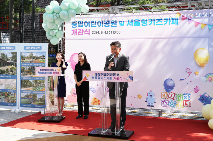 | ▲ 오승록 노원구청장이 4일 오전 10시 서울 노원구 하계2동 중평어린이공원에서 열린 ‘중평어린이공원 및 서울형 키즈카페 개관식’에 참석해 인사말을 하고 있다. |