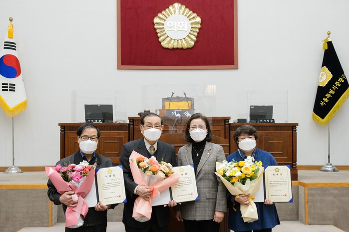 | ▲ (오른쪽부터) 결산검사 대표위원을 맡은 오화근 중랑구의원, 은승희 중랑구의장, 한복희 결산검사위원, 김정배 결산검사위원이 기념촬영을 하고 있다.(사진제공=중랑구의회) |