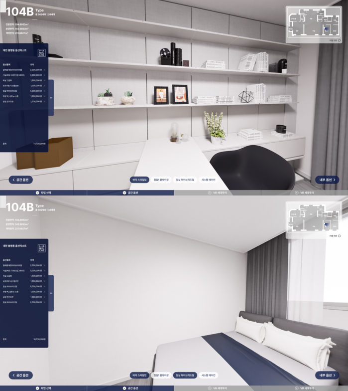특히 이 솔루션은 모델하우스로 구현되지 않은 미건립 세대에서도 강력한 효과를 발휘한다. 실물 공간 없이도 다양한 평면 구성과 옵션 조합을 체험할 수 있어, 분양 초기 단계부터 설득력을 높일 수 있다.