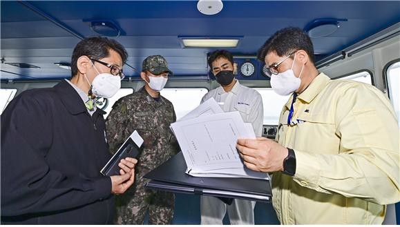 | ▲ 25일 3함대 선박 임검장교와 목포지방해양수산청의 합동 임검요원이 퀸 제누비아호에서 해상 위협상황과 안전항로 등을 안내하고, 위협에 대비할 수 있도록 운항 준비 태세를 철저히 점검하고 있다. (사진=해군3함대 장석훈 상사) |