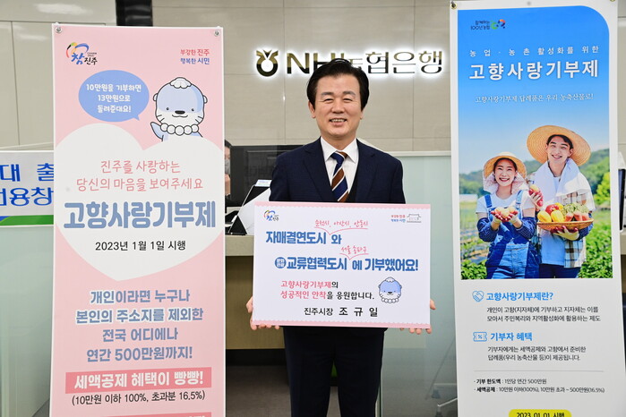 지난 2월에는 서울에 거주하고 있는 재경진주고동창회 김천호 회장이 진주시에 고향사랑기부금 최고 한도액인 500만 원을 기부하면서 기부 열기를 끌어올리기도 했다. 고향 진주를 생각하는 마음과 함께 전달된 기부금뿐만 아니라 기부금의 30%인 150만 원어치의 답례품도 진주시를 위해 재기부하면서 고향에 대한 남다른 애정을 보여주기도 했다.