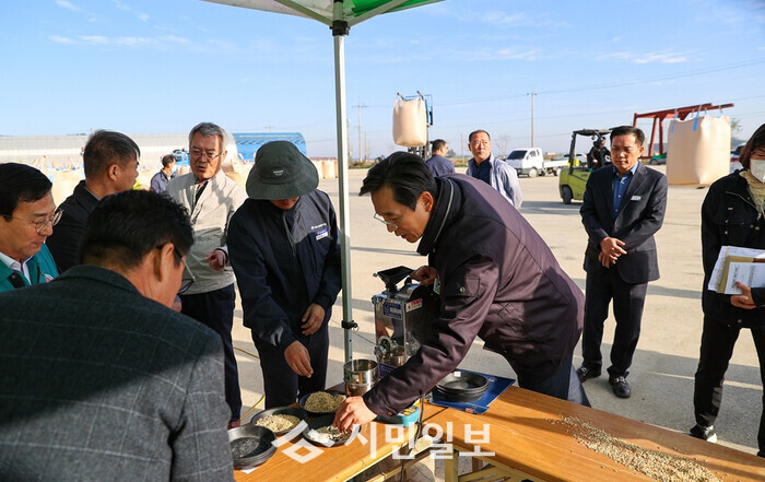 | ▲ 우승희 영암군수(사진 가운데)가 지난해 2024년산 공공비축 건조벼 수매현장을 방문해 벼의 상태를 점검하고 있다 / 영암군 제공. |