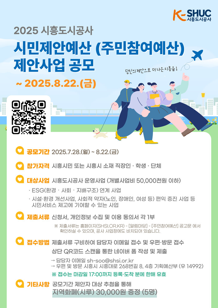 공모 접수는 공사 홈페이지, 우편 접수, 시설 방문 등을 통해 접수할 수 있으며, 제안자 중 추첨을 통해 5명에게 지역화폐(시루) 3만원을 지급할 예정이다. 제안된 사업은 소관부서 검토 후 시민제안예산위원회 의결로 최종 선정하여 2026년도 예산 편성에 반영할 예정이다.