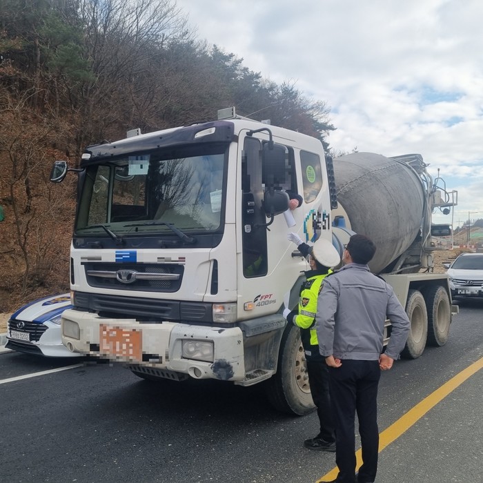 이에 양산경찰서(서장 정성학)는 미연의 사고를 방지하기 위해 ‘21. 12. 10.(금) 13:00~15:00경’ 신도시 개발 사업 진행 되고 있는 양산시 사송 아파트 건설현장 일대에서 화물차량 자재 운반 담당자들을 대상으로 좌·우회전시 보행자 보호를 위한 일시정지 홍보활동을 나섰다.