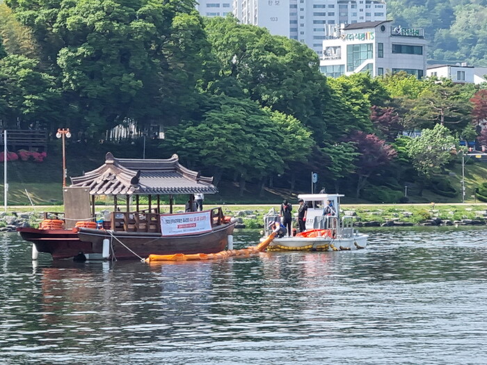 이번 훈련은 김시민호 탑승객 중 익수자 발생과 엔진 고장으로 인한 기름 유출 상황을 가정하여, 실제 익수자에 대한 신속한 인명 구조활동과 유람선 기름 유출로 인한 남강의 오염 확산 방지를 위한 오일펜스와 흡착포를 이용한 유류제거 작업으로 진행되었다.