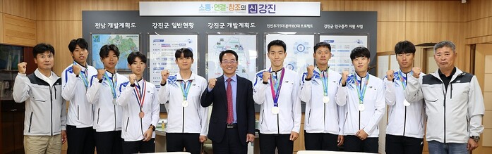 | ▲ 강진원 강진군수(가운데)가 지난 20일 104회 전국체전 단체 경기에서 은메달 7개 개인 경기 금메달 등 우수한 성적을 거두고 군수실을 방문한 강진군청 사이클선수단을 격려한 후 기념촬영을 하고 있다. / 강진군 제공 |