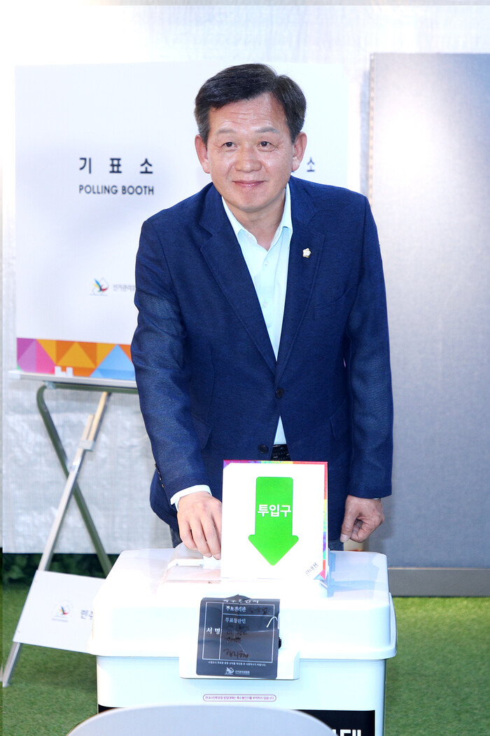 | ▲ 지난 29일 중구 동화동 주민센터에 마련된 사전투표소에서 윤판오 의장이 제21대 대통령 선거 사전투표를 하고 있다.(사진=중구의회 제공) |