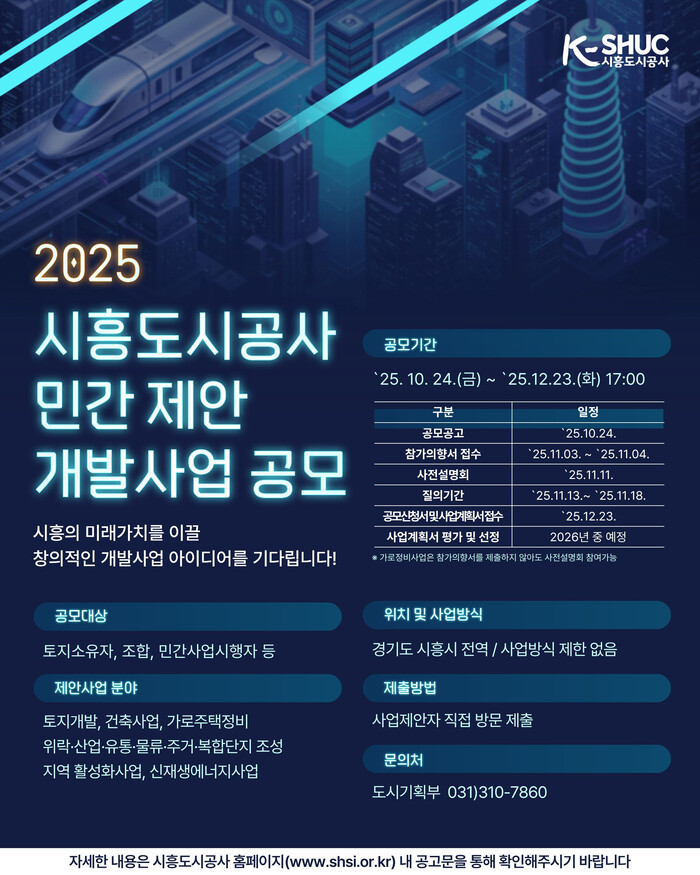 [시흥=송윤근 기자] 경기 시흥도시공사(사장 유병욱, 이하 공사)는 민간의 창의적인 개발 아이디어와 공사의 개발사업 역량을 결합하여, 신규 개발사업을 발굴하기 위한 ‘민간 제안 개발사업 공모’를 추진한다고 24일 밝혔다.