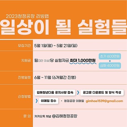 참여를 원하는 청년은 시 누리집과 김해청년다옴 누리집에서 공고를 확인 후 신청서를 이메일 로 접수하면 되며 카카오톡 채널 ‘김해청정공장’에서 1대1 상담도 가능하다.