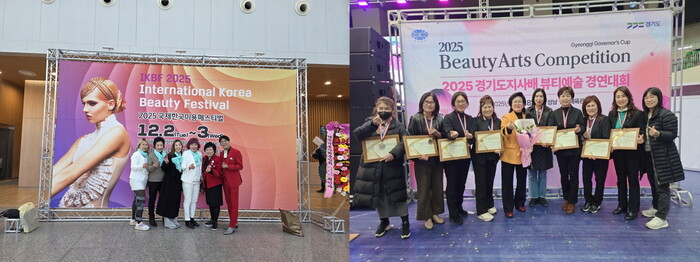 | ▲ 2025 국제한국미용페스티벌(왼쪽 사진)과 2025 경기도지사배 뷰티예술 경연대회(오른쪽 사진) 수상자들이 기념촬영을 하고 있다 /사진제공=안산시 |