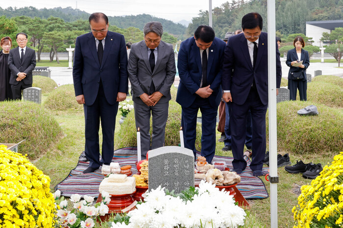 | ▲ 이정선 교육감(왼쪽 3번째)이 12일 국립5·18민주묘지에서 진행된 박관현 열사 43주기 추모식에서 강기정 광주시장, 이개호 의원 등과 함께 박관현 열사묘를 참배하고 있다. / 광주시교육청 제공 |