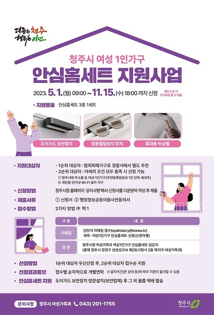 지원대상은 범죄피해가구 및 청주시에 주소를 둔 여성1인가구이다.