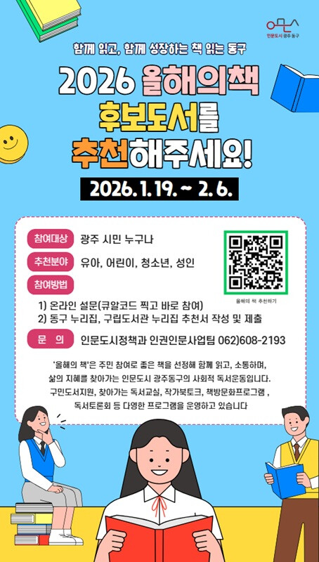 동구 관계자는 “올해의 책 선정은 지역 공동체가 함께 읽고 토론하는 독서 여정의 출발점”이라면서 “책을 통해 일상 속에서 사회적 공감과 참여가 자연스럽게 이어지길 바란다”고 말했다.