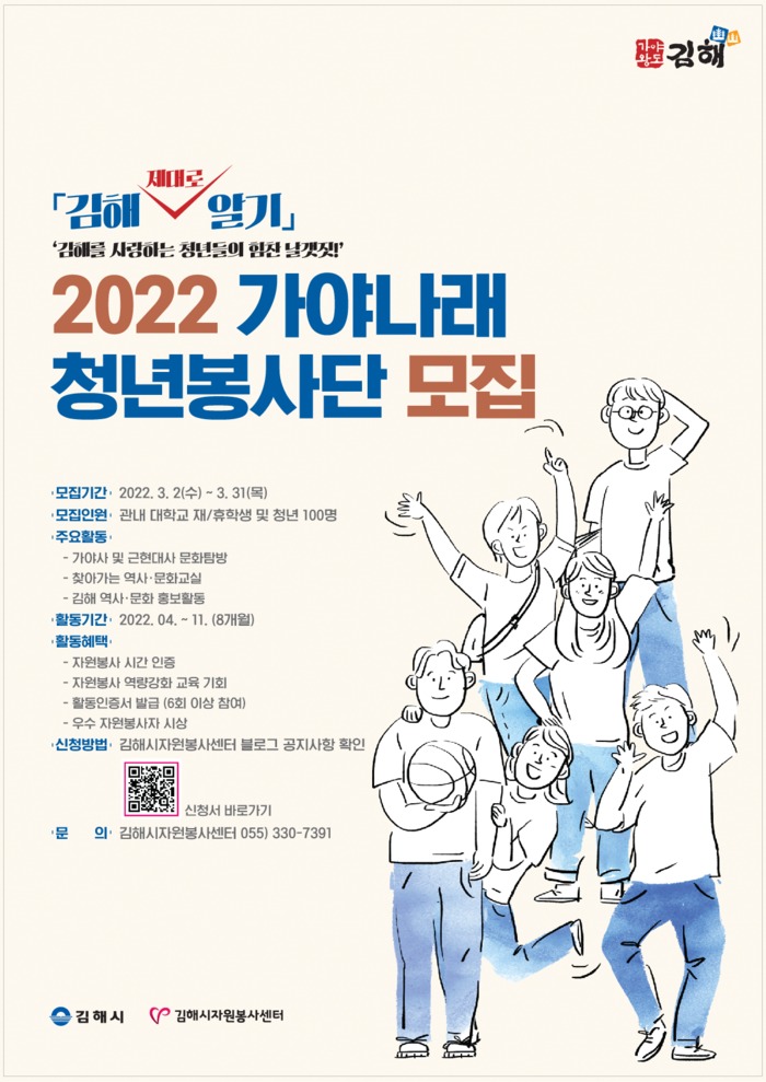 김해시자원봉사센터는 자원봉사에 열정을 가진 2030청년세대를 대상으로 ‘2022 가야나래 청년봉사단’ 을 모집한다고 14일 밝혔다.