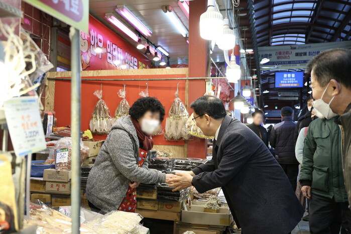 사진=‘2023년 설맞이 전통시장 장터달구미 행사’에서 시장상인과 인사를 하고 있는 문헌일 구청장.(사진=구로구청 제공)