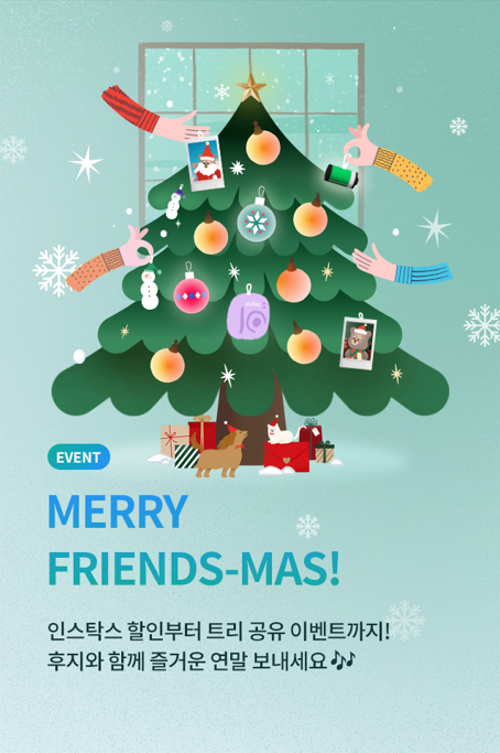 먼저 12월 13일부터 31일까지 ‘인스탁스 2024 크리스마스 캠페인’의 일환으로 친구와 함께 크리스마스 트리를 꾸미는 ‘후지트리와 메리 프렌즈마스’ 이벤트를 실시한다.