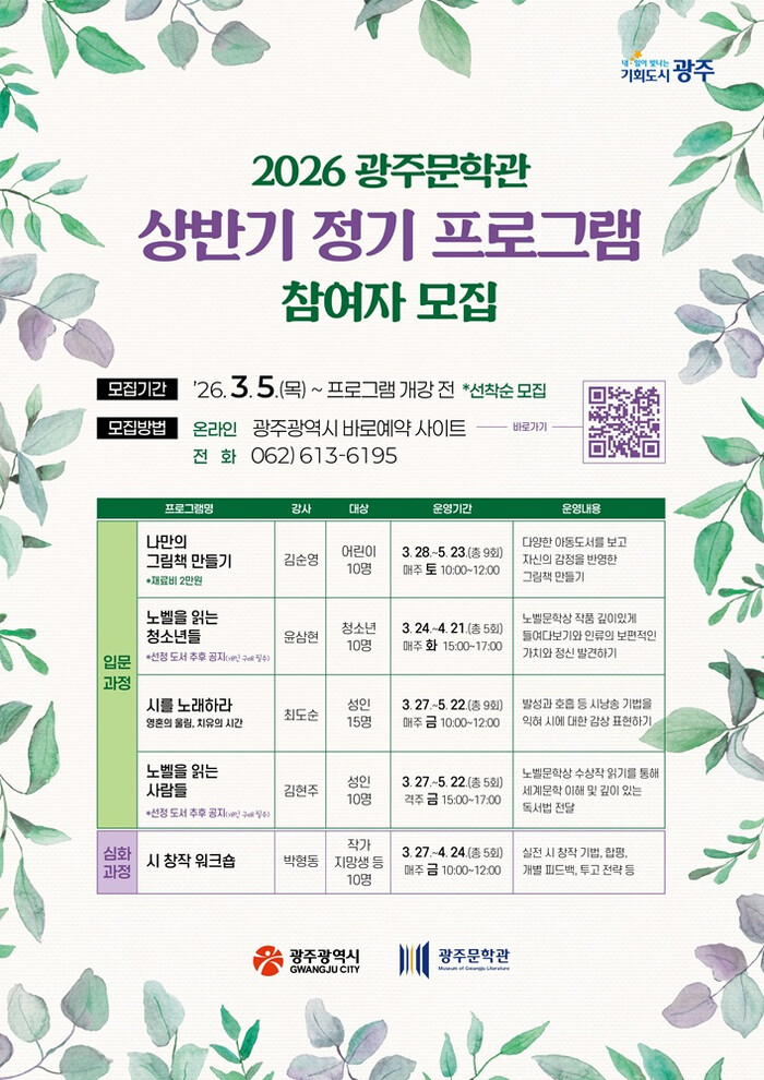 수강 신청은 5일부터 광주문학관 누리집과 전화 접수를 통해 강좌별로 선착순 모집한다.