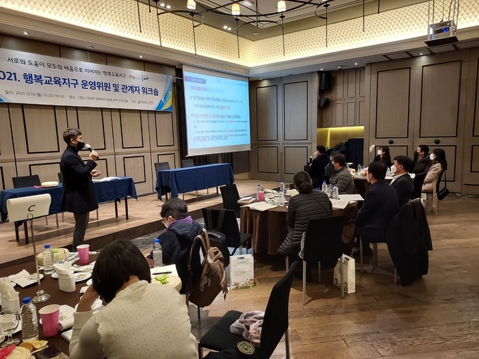 경상남도교육청(교육감 박종훈)은 2021년 지난 13일(월) 오전 10시30분 부터18시까지 창원 그랜드 머큐어 앰버서더 호텔 아모르실에서 2021년 행복교육지구 주요사업 성과 공유 및 지역네트워크 구축을 위한 행복교육지구 운영위원 및 관계자 네트워크 워그숍을 가졌다.