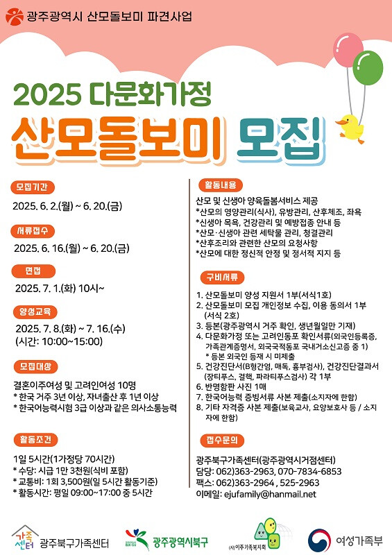 [광주=정찬남 기자] 광주광역시(시장 강기정)는 다문화가정 산모와 신생아에게 양육 돌봄을 지원하기 위해 ‘2025년 다문화가정 산모돌보미’를 모집한다.