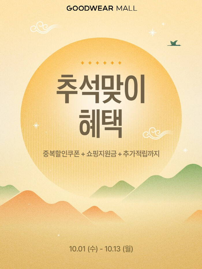 [시민일보 = 여영준 기자] 신성통상이 운영하는 패션·라이프스타일 플랫폼 굿웨어몰이 추석을 맞아 10월1일 오전 9시부터 10월13일 오전 8시59분까지 특별 프로모션을 진행한다.