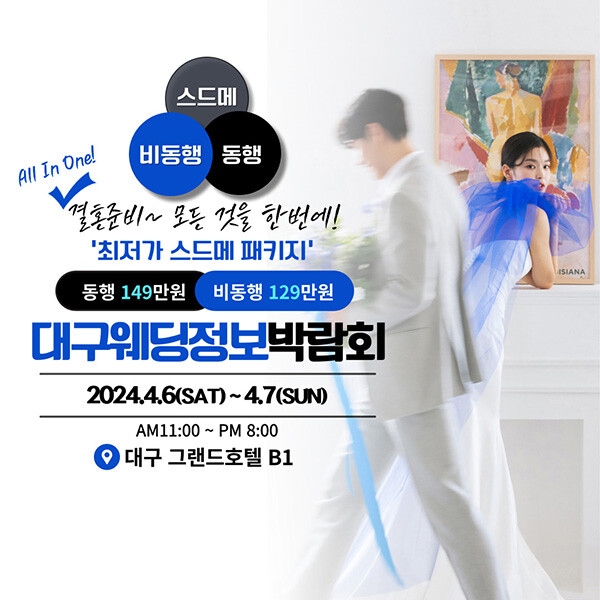 대구 그랜드호텔 지하 1층에서 4월 6일(토)과 7일(일) 양일간 열리는 대구웨딩정보박람회가 개최된다.