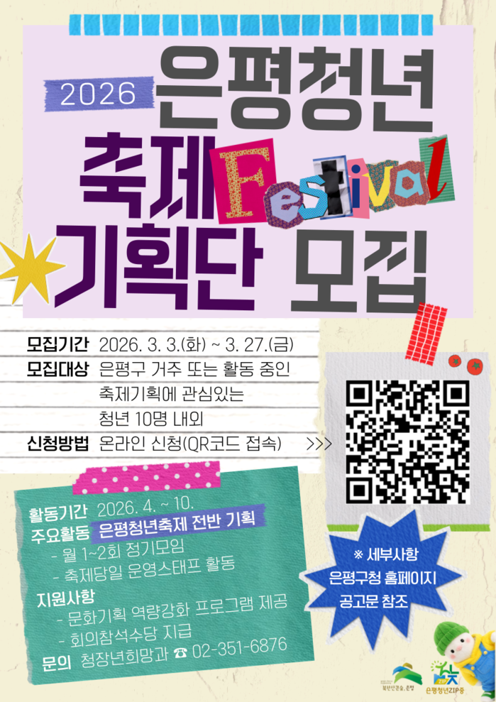 김미경 은평구청장은 “청년이 단순한 참여자가 아닌 축제의 주체로 나서는 과정 자체가 중요한 경험”이라며 “새로운 청년 축제를 만들어 갈 젊은 열정을 가진 청년들의 많은 지원을 바란다”고 밝혔다.