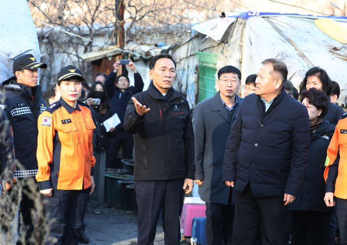 [사진1] 구룡마을을 방문한 이상민 행정안전부 장관(오른쪽)에게 화재 예방 대책에 대해 설명하고 있는 조성명 강남구청장(가운데)