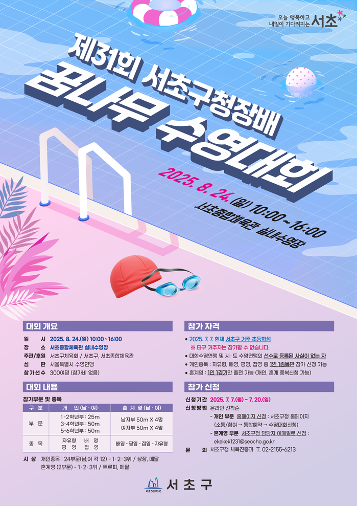 [시민일보 = 박소진 기자] 서울 서초구(구청장 전성수)는 24일 오전 10시부터 서초종합체육관 실내수영장에서 ‘제31회 서초구청장배 꿈나무 수영대회’를 개최한다고 밝혔다.