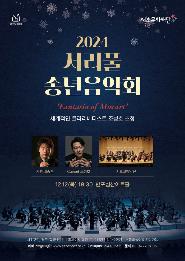 2024년 끝자락을 공연으로 마무리하고자 하는 관객들을 위해 준비한 서리풀 송년음악회에서는 서초교향악단의 명품 공연 프로그램들을 선보인다. ‘Fantasia of Mozart’라는 부제목으로 구성한 프로그램은 모차르트의 작품들로 프로그램을 구성하였다. 모차르트의 오페라 ‘피가로의 결혼’ 서곡으로 공연의 시작을 열고 레하르의 금과 은의 왈츠, 이바노비치의 다뉴브강의 잔물결 왈츠를 연주한다.