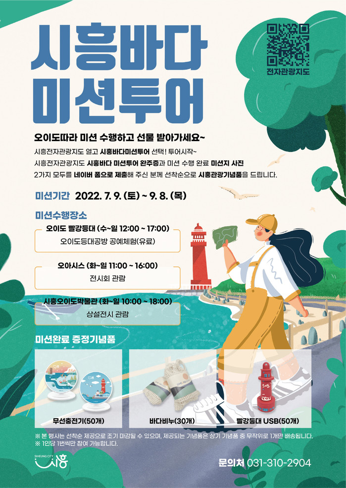 참가 방법은 시흥전자관광지도에 접속해 스탬프투어 코스 중 ‘시흥바다 미션투어’를 선택하고, 미션 장소인 오이도 등대공방–오아시스((구)함상전망대)-시흥 오이도 박물관에 방문해 발급된 모바일 완주증과 함께, 미션 수행 후 미션장소에 비치된 스탬프가 모두 찍힌 미션지를 촬영한 사진을 네이버 폼으로 제출하면, 완주 기념품(무선 충전기, 바다 비누, 오이도 USB)을 선착순으로 제공한다.