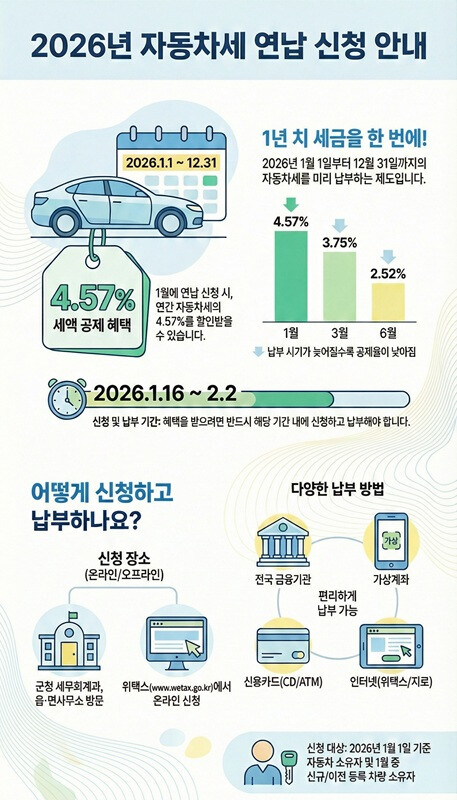 자동차세는 매년 6월과 12월 두 차례 부과되는데, 1월에 연납하면 연세액의 4.57%를 공제받을 수 있다.
