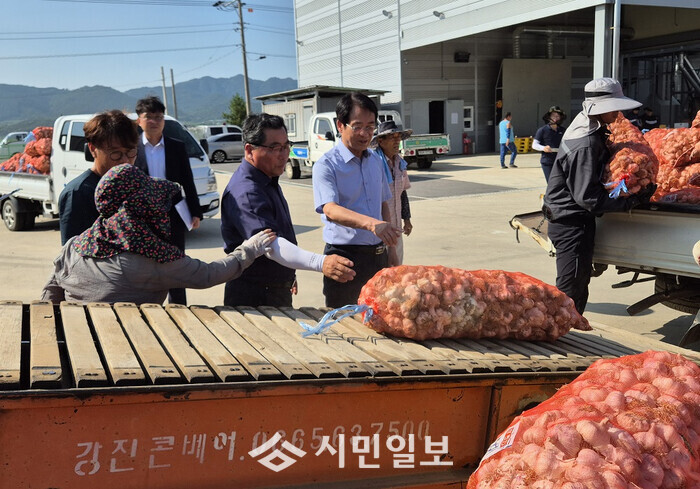 | ▲ 강진원 강진군수(사진 가운데)가 작천면 마늘 수매 현장을 찾아 출하된 마늘포대를 살펴보고 있다. / 강진군 제공 |