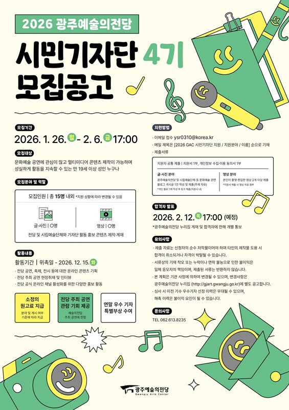 선발된 시민기자단은 오는 3월부터 12월 말까지 약 10개월간 활동하며, 광주예술의전당의 공연과 문화예술 현장을 취재해 기사와 콘텐츠를 제작하게 된다. 전당은 활동 기자단에게 소정의 원고료, 공연 관람 기회, 우수 기자 시상 등 다양한 혜택을 제공할 예정이다.