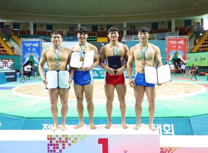 [영암=정찬남 기자] 전남 영암군민속씨름단이 구례실내체육관에서 열린 ‘제104회 전국체육대회 씨름’에 출전해 금 2, 은 2, 동 1, 5메달을 획득했다.