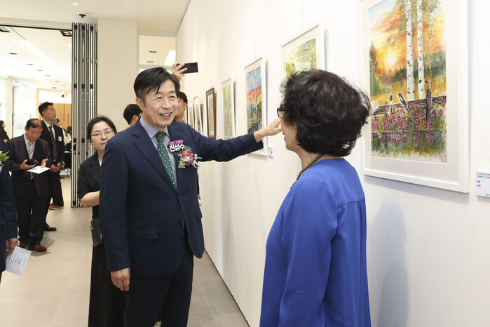 | ▲ ‘행복한 노년, 서초애 산다’ 행사에서 전성수 구청장(왼쪽)이 노인의 예술작품을 감상하며 소통하고 있다. (사진=서초구청 제공) |