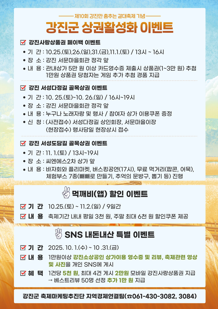 이번 이벤트는 상가 방문객 및 소비 촉진을 유도해 진읍 골목상권의 활력을 불어넣기 위해 진행되며, 주요 이벤트로는 강진사랑상품권 페이백 이벤트, 강진 서성다정길 골목상권 이벤트, 강진 서성도담길 골목상권 이벤트, ‘강진맛깨비’ 먹깨비 할인 이벤트, SNS 내돈내산 특별 이벤트 등이 있다.