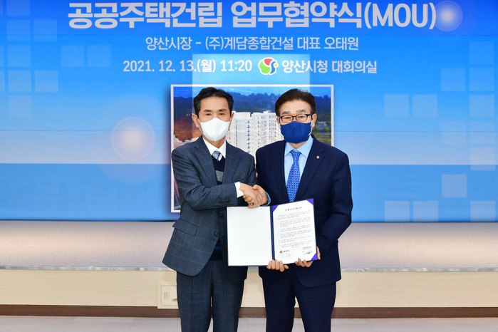 (주)계담종합건설 및 본청건축사 사무소 오태원 대표는 양산시 물금읍 가촌 출신으로 100억원 상당의 100여 세대 공공주택을 건립하여 기부하기로 하고, 양산시는 이를 수락, 13일 양해각서를 체결했다.
