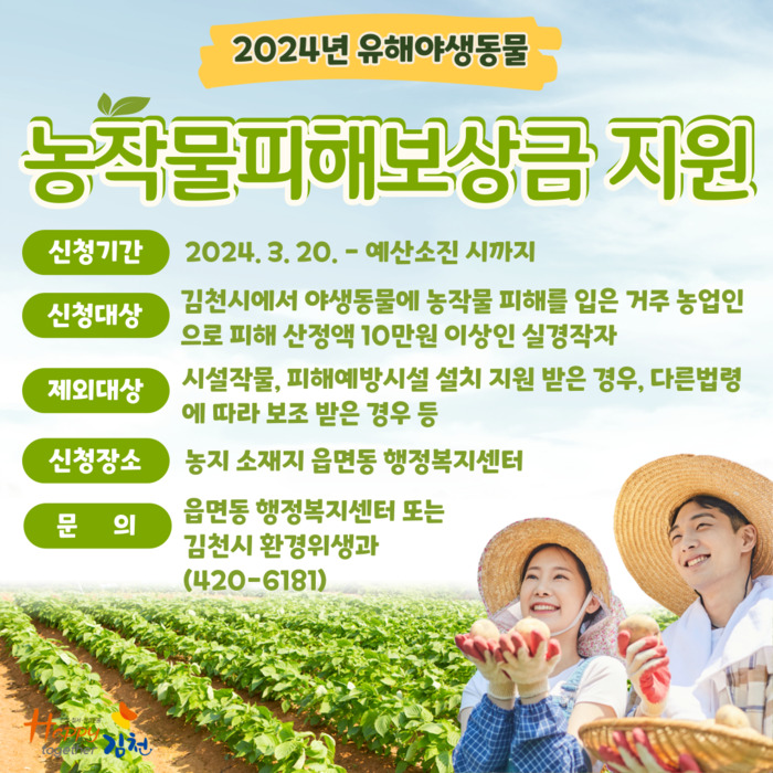 지원 사업은 3월 20일부터 예산 소진 시까지이며, 지원 대상은 관내 농경지에서 야생동물로 인한 농작물의 피해를 본 농·임업인이며 김천시에 주소를 둔 시민이어야 한다.