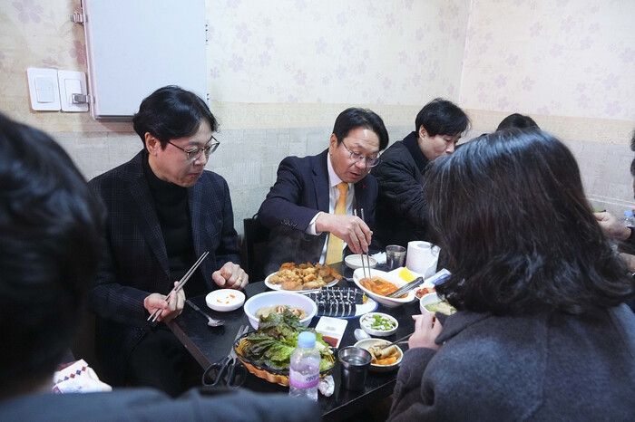 | ▲ 강기정 광주광역시장(사진 가운데)이 지난 1월23일 오전 서구 광주상공회의소에서 열린 2025 광주경제 '다함께 착착착(착한소비·착한금융·착한일자리)' 행사를 마친 뒤 인근 식당을 찾아 직원들과 점심식사를고 있다./광주광역시 제공 |
