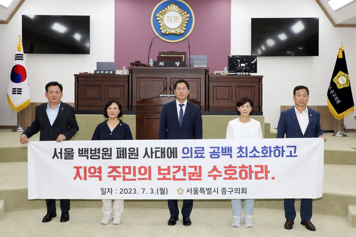 [시민일보 = 여영준 기자] 서울 중구의회(의장 길기영)가 지난 3일 본회의장에서 백병원 폐원 결정에 따른 의료 공백을 우려하며 대책 마련을 촉구하는 성명서를 발표했다.