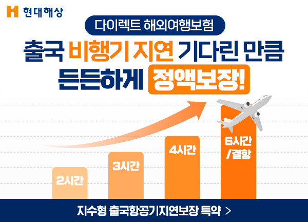 15일 현대해상에 따르면, 지수형 출국 항공기 지연보장 특약은 국내에서 출발하는 국제선 항공편이 2시간 이상 지연되거나 결항되는 경우, 지연 시간에 비례하여 최소 4만원에서 최대 10만원까지 정액으로 보험금을 지급하는 특약이다.