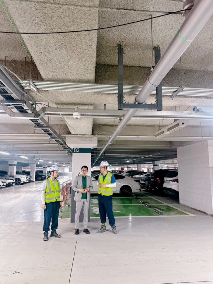 | ▲ 김기상 의원(가운데)이 올림픽파크포레온 지하주차장에서 전기차 충전 시설를 확인하고 있다. |