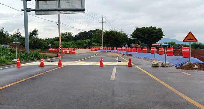 이 도로는 지난 7월 지속적인 강우 기간에 경사지와 인접한 도로 30m구간 한쪽 차선이 내려앉아 유실되면서 차량 통행이 전면 통제돼왔다.