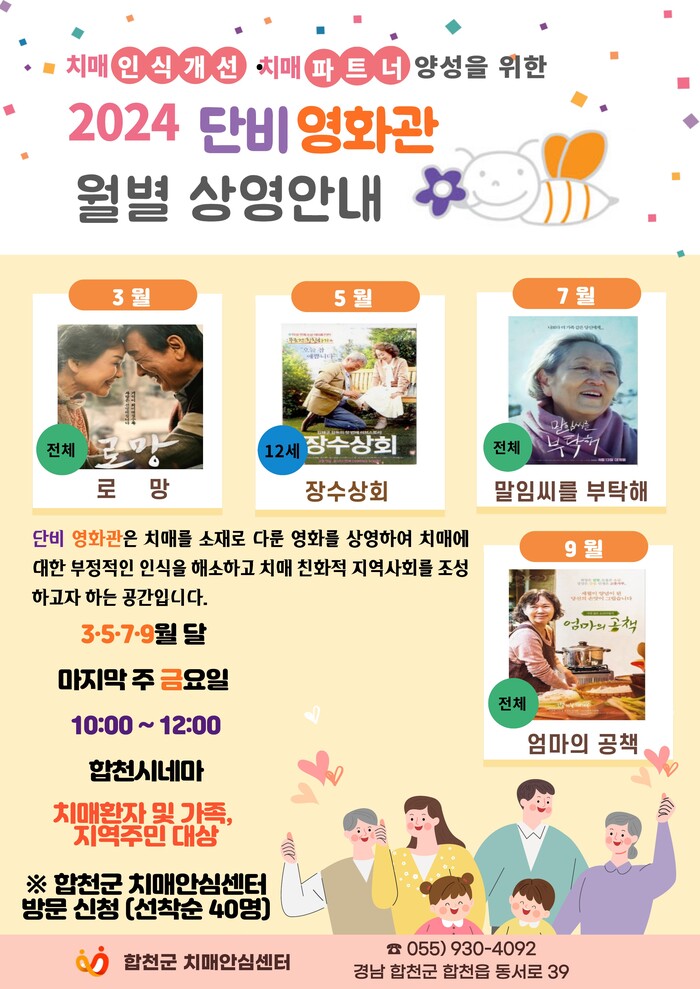 단비는 치매인식개선 및 치매파트너 마스코트로 이번 단비영화관은 치매를 소재로 한 영화를 상영한다. 지역주민들의 치매에 대한 올바른 인식을 돕고, 치매환자와 가족에게는 여가·문화생활을 즐길 수 있는 기회를 제공하기 위해 마련됐다. 3,5,7,9월 마지막주 금요일 10시부터 12시까지 합천시네마에서 상영한다.