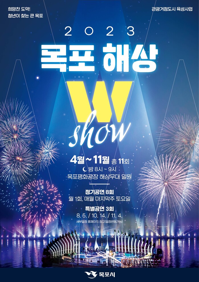 평화광장 해상무대에서 펼쳐지는 해상W쇼는 오는 29일부터 11월까지 매월 마지막 주 토요일 밤 8시부터 9시까지 정기 공연한다.또한, 여름휴가철 특별공연(8.5), 제104회 전국체육대회 기념(10.14), 제43회 전국장애인체육대회 기념(11.4) 특별공연도 3회 추가 편성해 다채로운 볼거리를 선사할 예정이다.