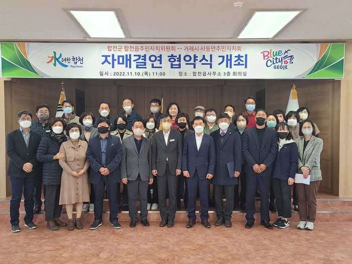 이날 협약식에는 노상도 합천읍주민자치위원장 및 회원 15여 명, 김용운 거제시 사등면주민자치회장 및 회원 15여 명이 참여했으며, 자매결연 협약서 작성, 합천읍 합천복합문화센터 소개 순으로 진행됐다.