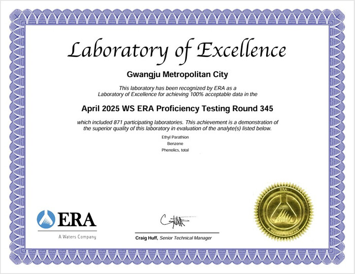 광주광역시(시장 강기정)는 상수도사업본부 수질연구소가 올해 환경부 국립환경과학원 주관 숙련도 시험과 국제공인 숙련도 시험 운영기관(ERA) 숙련도 프로그램에 참여해 18개 항목 모두 ‘만족(Satisfactory)’ 판정을 받아 측정분석 능력 우수기관으로 선정됐다고 20일 밝혔다.
